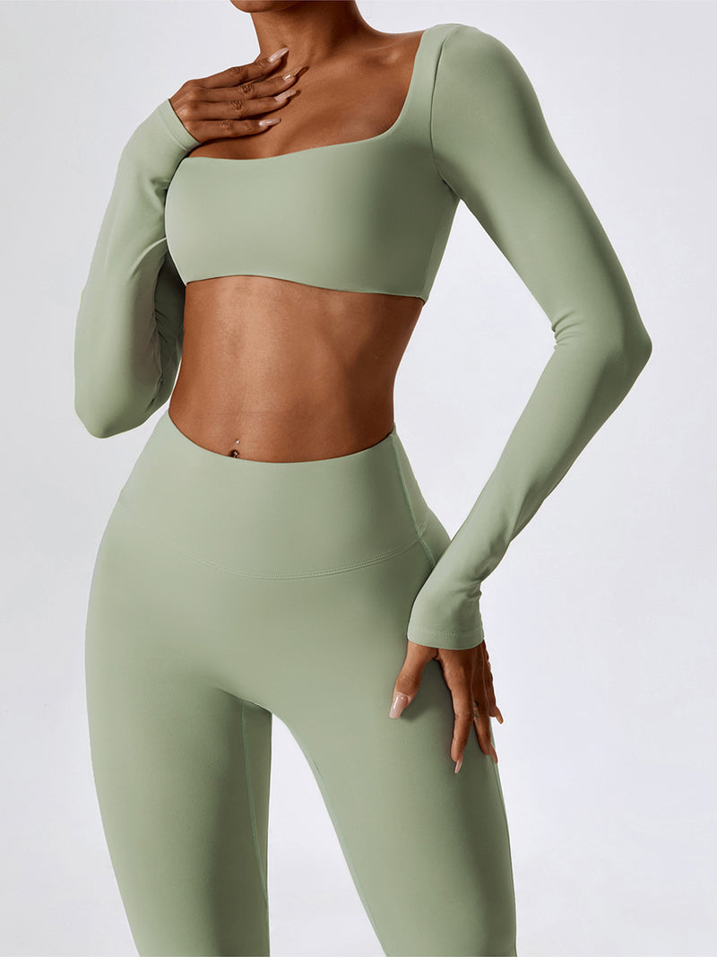 A soft, second-skin fit with a bold neckline and cropped silhouette made to move.